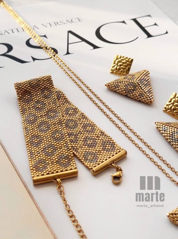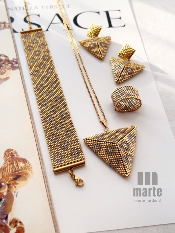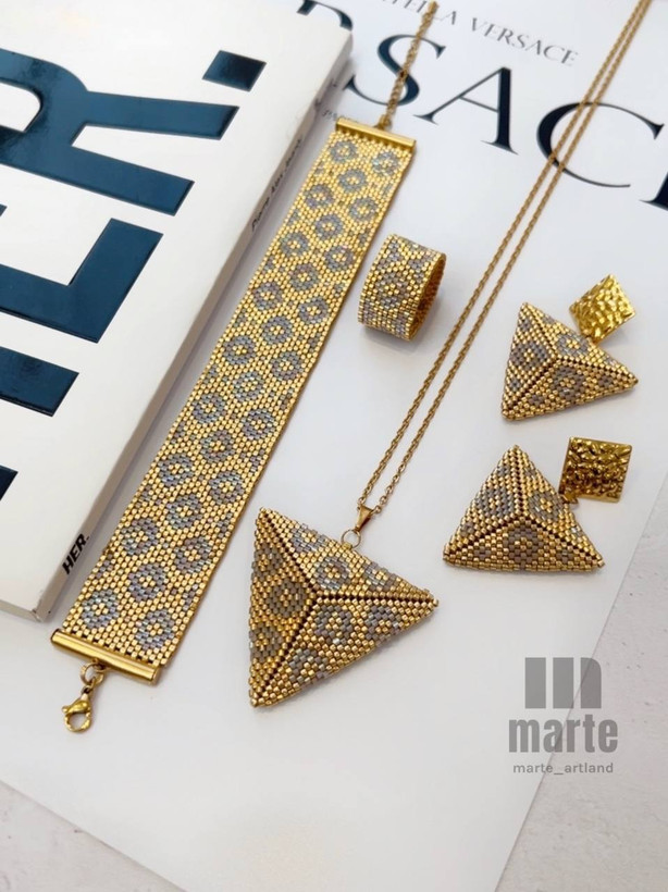 ست جواهرات دست‌ساز «دیبا» | شامل دستبند، گردنبند، انگشتر و گوشواره (بافت مهره‌ای مثلثی)